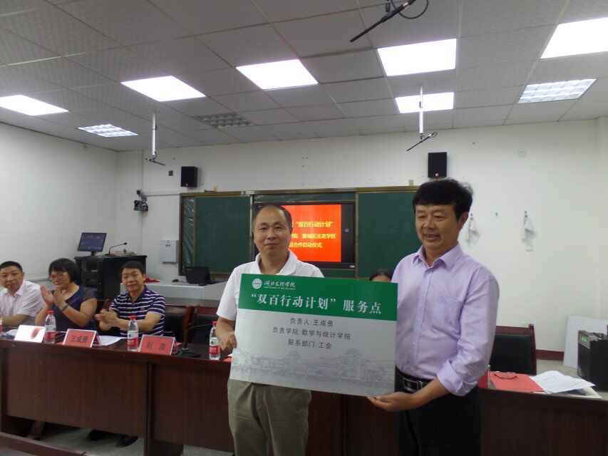 (數(shù)學(xué)與統(tǒng)計(jì)學(xué)院 通訊員 耿付荃)2018年6月1日下午,數(shù)學(xué)與統(tǒng)計(jì)學(xué)院到“雙百行動(dòng)計(jì)劃”服務(wù)點(diǎn)襄城區(qū)法龍學(xué)區(qū)舉行項(xiàng)目合作啟動(dòng)儀式。數(shù)學(xué)與統(tǒng)計(jì)學(xué)院黨委書(shū)記劉浩、院長(zhǎng)王成勇、專(zhuān)業(yè)負(fù)責(zé)人丁凌、系主任張旻嵩、肖氏武、“國(guó)培計(jì)劃”培訓(xùn)師游學(xué)民、襄城區(qū)歐廟鎮(zhèn)鎮(zhèn)長(zhǎng)張棟梁、襄城區(qū)教育局繼教中心主任鄭艷、襄城區(qū)法龍學(xué)區(qū)黨總支書(shū)記、校長(zhǎng)鄭思發(fā)、襄城區(qū)法龍中學(xué)黨支部書(shū)記、副校長(zhǎng)袁光宏出席項(xiàng)目合作啟動(dòng)儀式。
