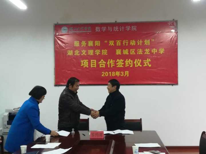 (數學與統(tǒng)計學院 通訊員 耿付荃) 2018年3月19日下午3:30在學院三樓會議室舉行服務襄陽“雙百行動計劃”項目合作簽約儀式。出席簽約儀式的有襄城區(qū)法龍學區(qū)領導袁光宏、姚明海、徐勇華、李俊,學院院長王成勇,教授、博士、教師代表。儀式由院長王成勇主持。