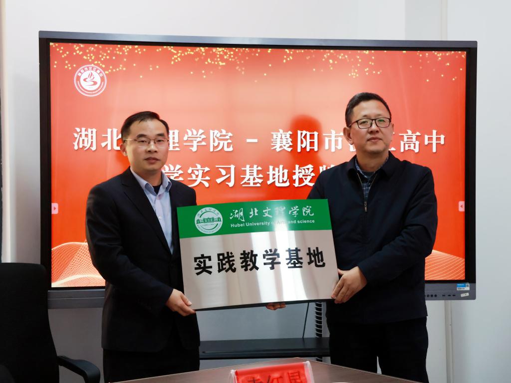 袁紅星代表學(xué)院與襄陽市漢江高中簽訂實踐教學(xué)和就業(yè)基地合作協(xié)議,并向襄陽市漢江高中實踐教學(xué)基地授牌。
