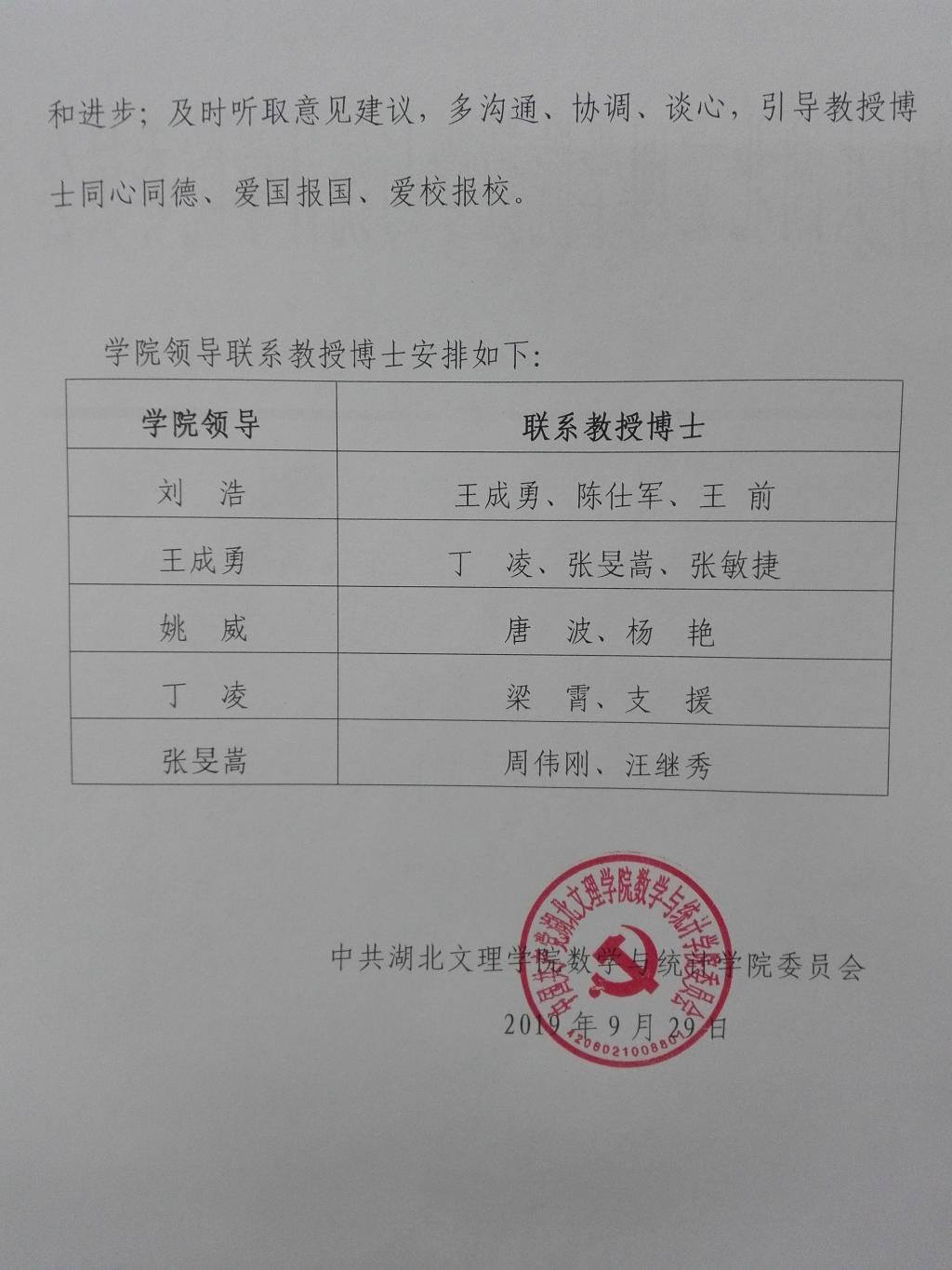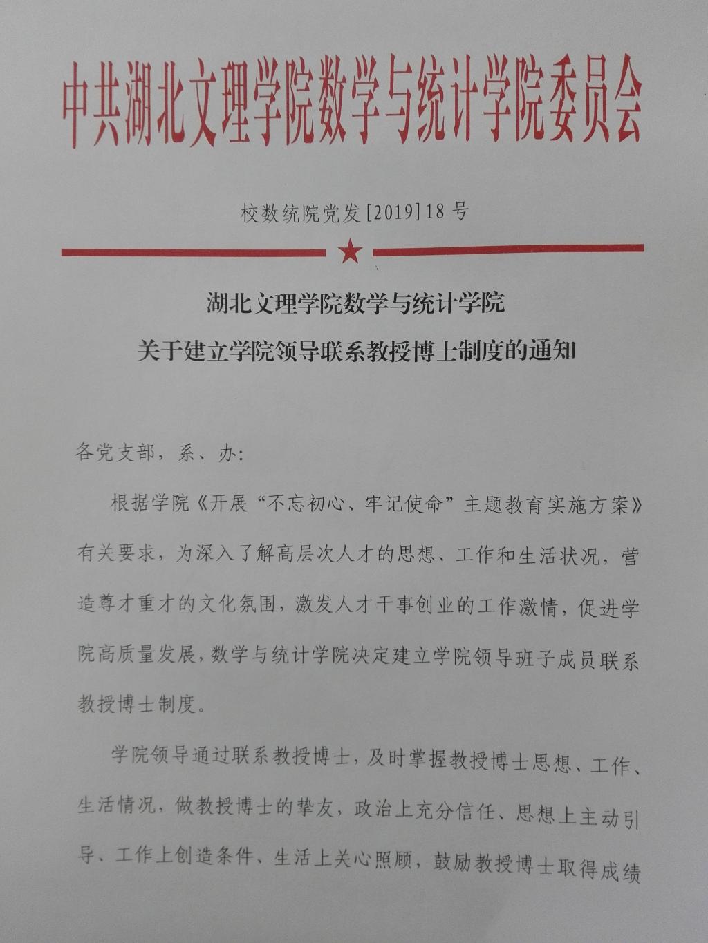 湖北文理學院數學與統計學院關于建立學院領導聯系教授博士制度的通知