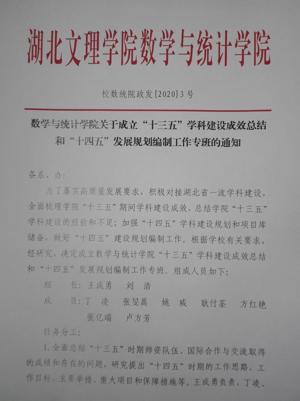 數(shù)學與統(tǒng)計學院關(guān)于成立“十三五”學科建設(shè)成效總結(jié)和“十四五”發(fā)展規(guī)劃編制工作專班的通知