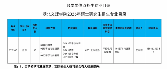 3、2026年湖北文理學(xué)院數(shù)學(xué)與統(tǒng)計學(xué)院數(shù)學(xué)學(xué)碩咨詢QQ群:622026674,我校將在研究生處網(wǎng)站上及時發(fā)布招生相關(guān)信息,請考生在報名、初試、復(fù)試、錄取等階段上網(wǎng)查詢。研究生處網(wǎng)址:http://yjsc.hbuas.edu.cn 。