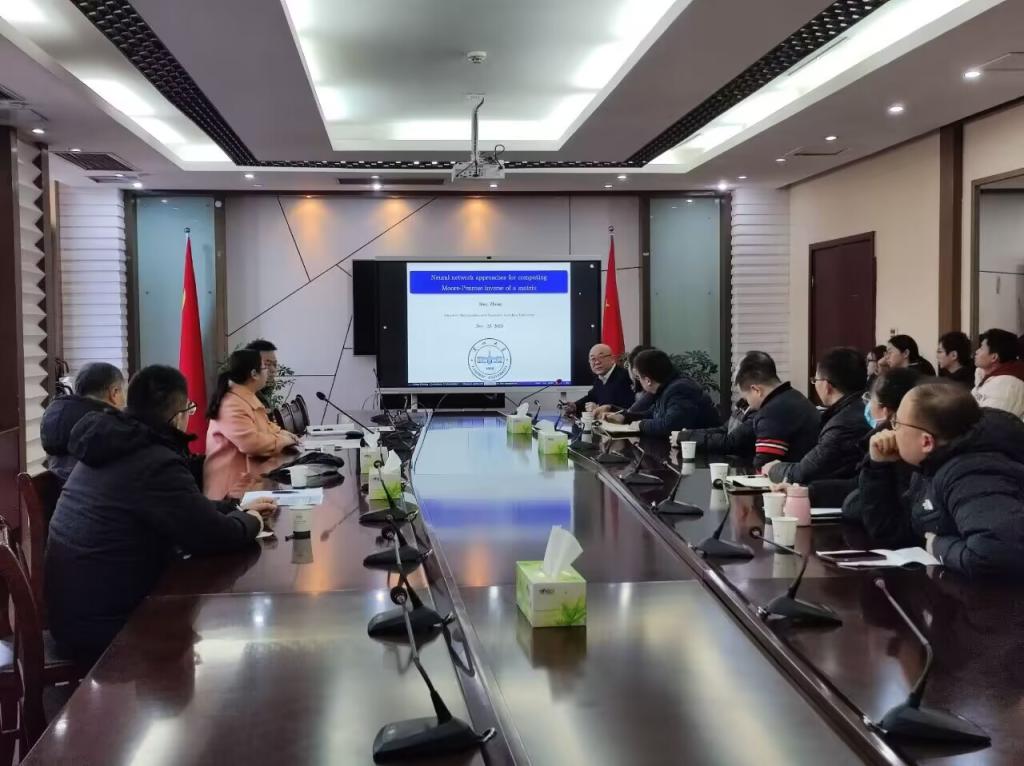 鄭兵教授作了題為《Neural network approaches for computing Moore-Penrose inverse of a matrix》的學(xué)術(shù)報告,詳細的介紹了神經(jīng)網(wǎng)絡(luò)算法的發(fā)展歷史,遞歸神經(jīng)網(wǎng)絡(luò)模型,零神經(jīng)網(wǎng)絡(luò)模型以及具體的求解矩陣廣義逆的神經(jīng)網(wǎng)絡(luò)算法模型,并就相關(guān)問題與師生展開了深入的探討。之后,鄭兵教授對我院國家自然科學(xué)基金申報工作進行了指導(dǎo),尤其是對數(shù)值線性代數(shù)方向的申報書,從選題意義、研究背景、創(chuàng)新性等方面,給予了具體指導(dǎo),提出了建設(shè)性的建議。