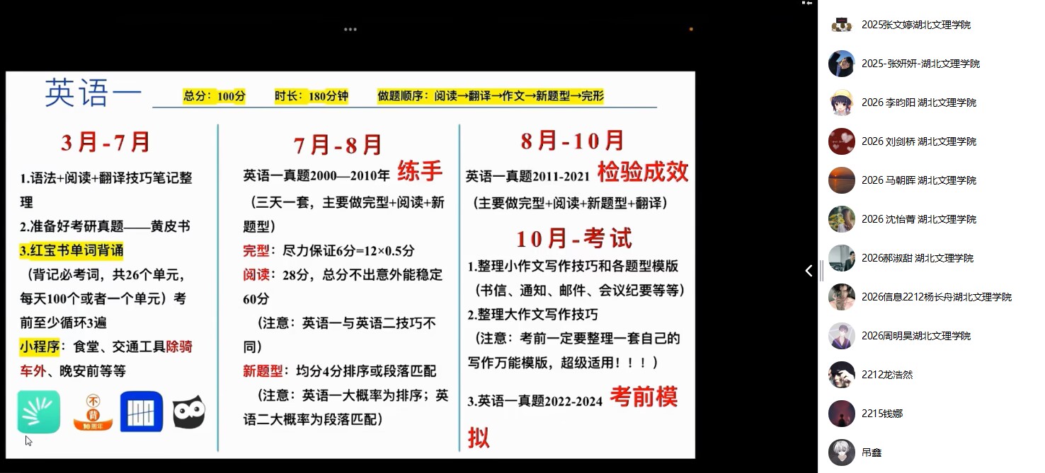 唐波、張敏捷、梁霄、陳仕軍、周景科、陶茂虎、王前等碩士生導(dǎo)師就個人研究方向進行了詳細的介紹。學(xué)院教師楊艷、姜海波就自命題科目進行考綱講解。本院20級畢業(yè)生鄧詩杰(考取湖北文理學(xué)院研究生)、楊志成(考取江西理工大學(xué)研究生)進行考研經(jīng)驗分享。