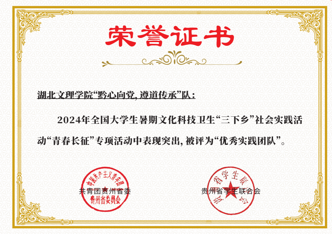(數(shù)學(xué)與統(tǒng)計學(xué)院 通訊員 趙微 張思薈)在2024年全國大學(xué)生暑期文化科技衛(wèi)生“三下鄉(xiāng)”社會實踐活動“青春長征”專項中,由湖北文理學(xué)院數(shù)學(xué)與統(tǒng)計學(xué)院輔導(dǎo)員趙微老師帶隊組織的“黔心向黨,遵道傳承”實踐隊,憑借出色表現(xiàn)榮獲“優(yōu)秀實踐團隊”。