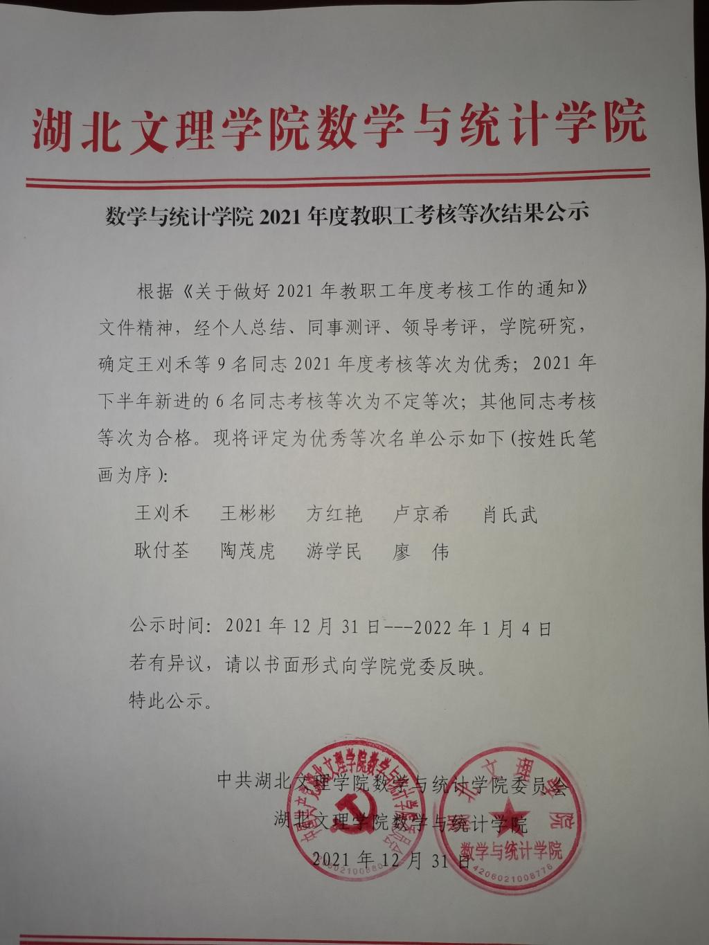 數(shù)學(xué)與統(tǒng)計學(xué)院2021年度教職工考核等次結(jié)果公示